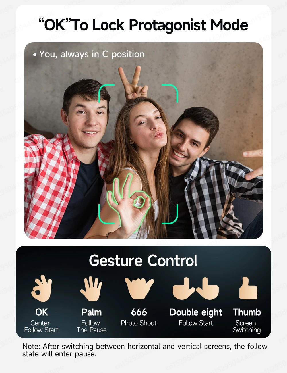 2. Gesture control, ‘OK’ lock protagonist mode;